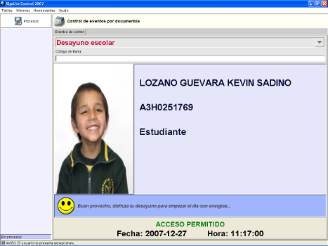 ° El registro de un evento en el sistema se realiza de forma sencilla; solo hay que pasar el carnet del estudiante por el lector de código de barras, el sistema inmediatamente registra el tipo de evento, la fecha y la hora en que se realizó y despliega la foto del estudiante, profesor o personal administrativo por pantalla. En caso de que el evento tenga restricciones configuradas (por ejemplo no se puede tomar dos almuerzos) el sistema rechaza el registro desplegando un mensaje en la pantalla del monitor..